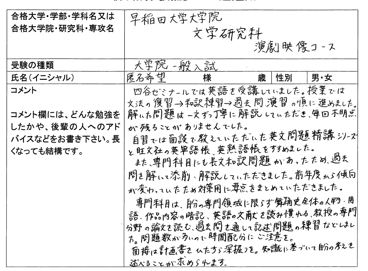 これまでに届いている、四谷ゼミナール受講生の方々の合格の声の一部を紹介いたします。