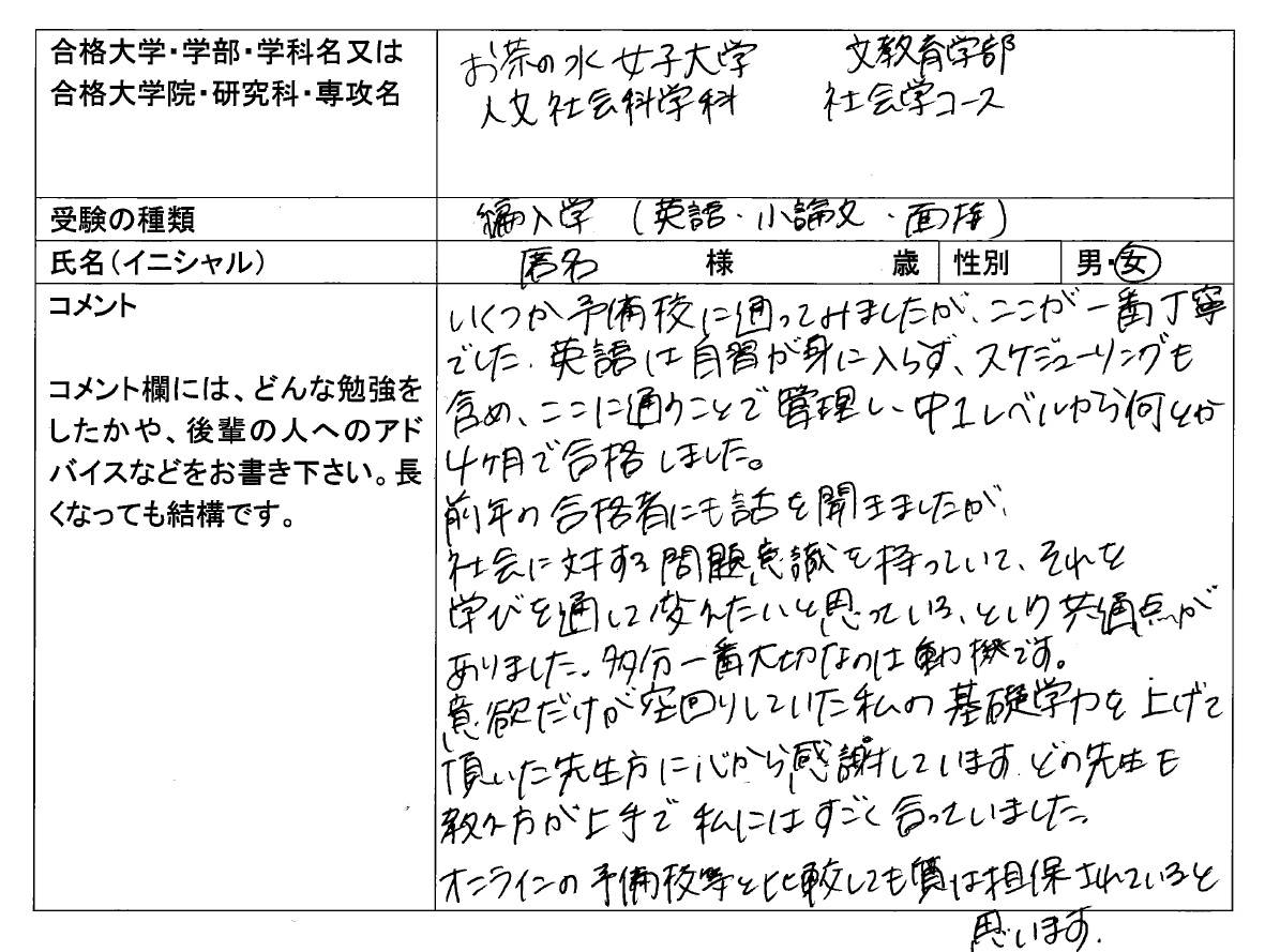 2026年度 お茶の水女子大学 文教育学部 社会学コース 合格